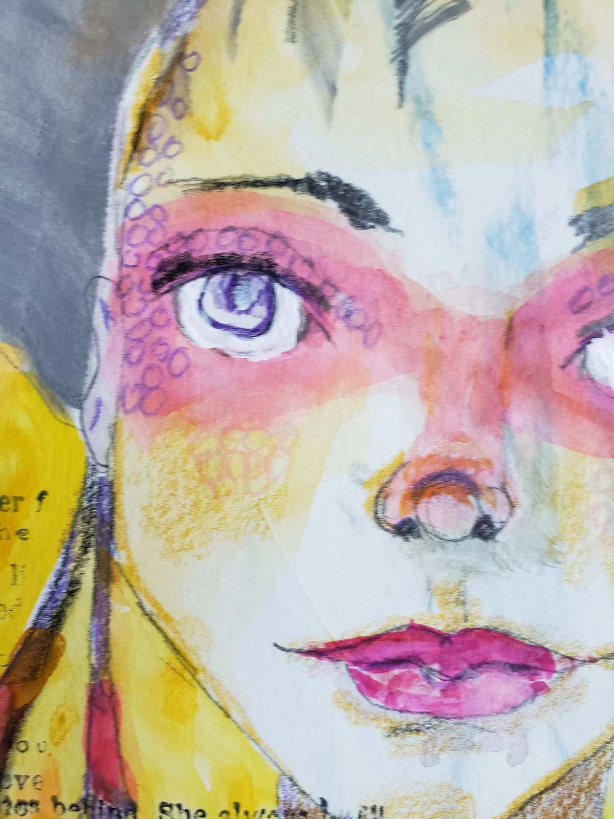 For this attempt, I pulled out some Folk Art cool white craft paint, and put down a basecoat. THEN I drew my girl. Then pulled out a few text stamps and stamped around the face of the girl for texture. This is a combination of Prisma Colored pencils, (the circles and marks all over the head), Daniel Smith watercolor, and Caran D'Arche gouache (grey hair, yellow background).
